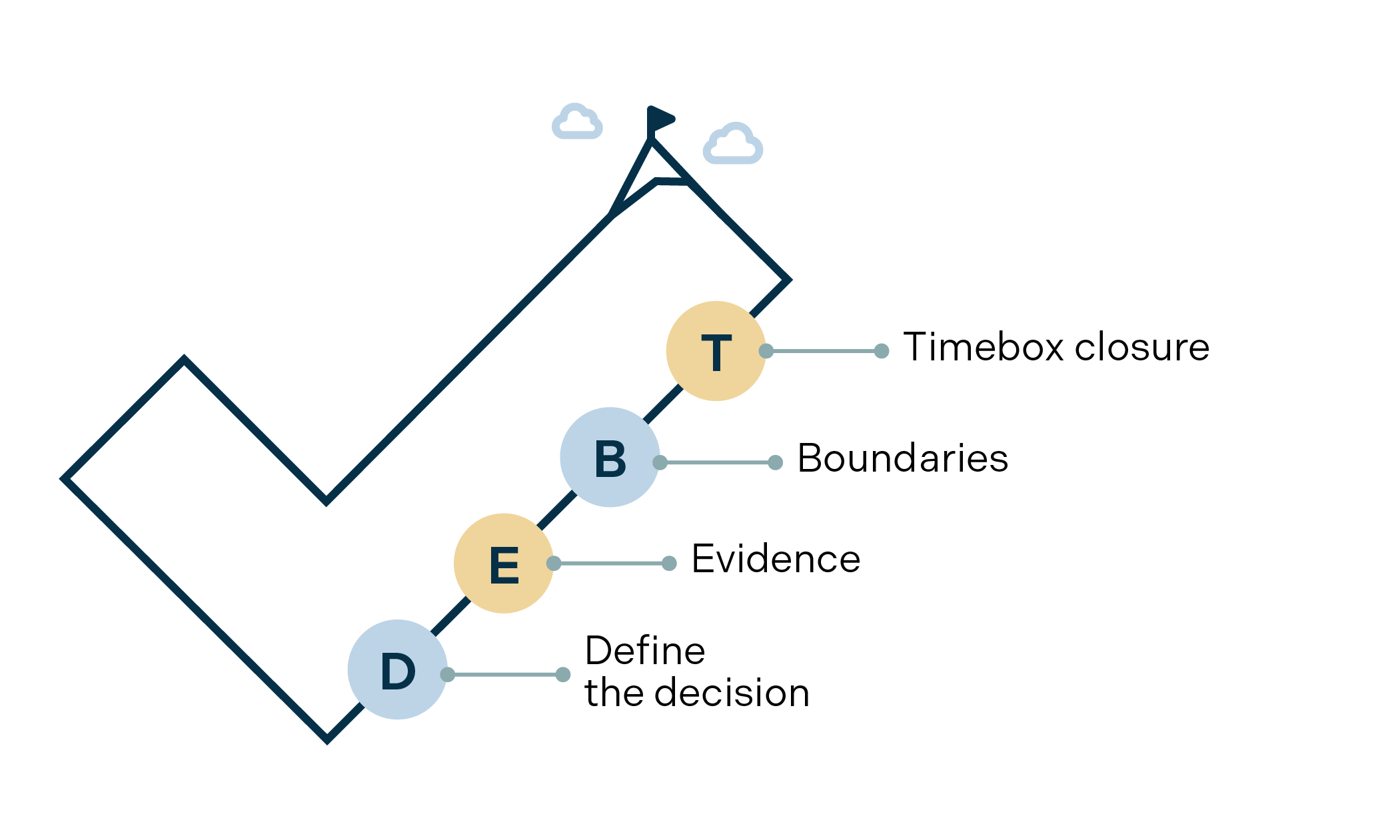 • Use the DEBT framework to force closure. Define the decision, limit the Evidence, set Boundaries, and Timebox the outcome to prevent re-litigation.